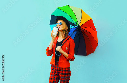 Young woman drinking coffee and holding colorful umbrella walking in red jacket, black hat on blue wall background