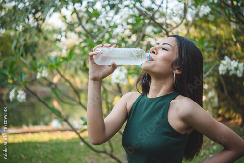 Young Woman Drinking Water bottle outdoor park traveler. Asian female drinking water bottle healthy person happy smile. Happiness Beautiful asian chinese women holding mineral water bottle lifestyle