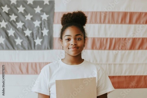 Young Woman Encouraging Voter Registration with American Flag Backdrop