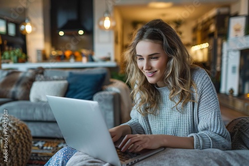 Young Woman Engaging in Online Video Chat with Man on Laptop in Living Room