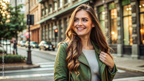 Young woman enjoying a vibrant city stroll during the afternoon light in a lively urban setting