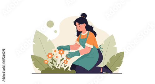 Young Woman Enjoying Gardening Cultivating Flowers In Garden At Home