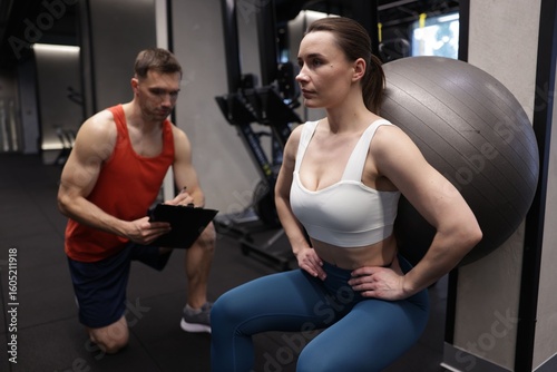 Young woman exercising with fitness ball near professional personal trainer in gym