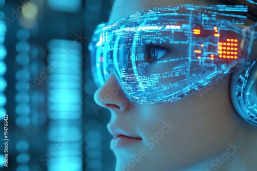 Young woman experiencing advanced virtual reality highlighted by futuristic blue digital overlays