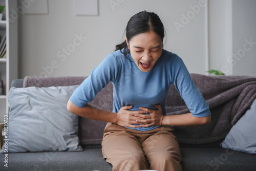 Young woman experiencing intense stomach pain on sofa at home, looking uncomfortable and worried, possibly suffering from cramps or bloating