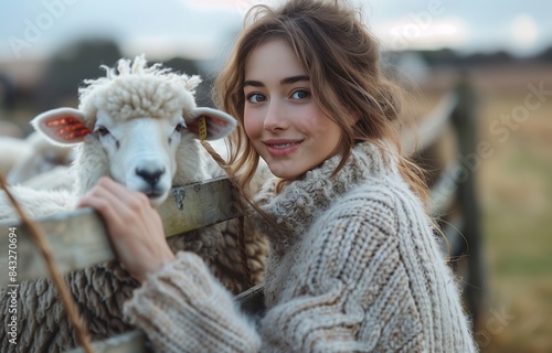 Young woman feeds sheep at farm, wearing beige sweater and jeans, enjoying animal interaction by wooden fence
