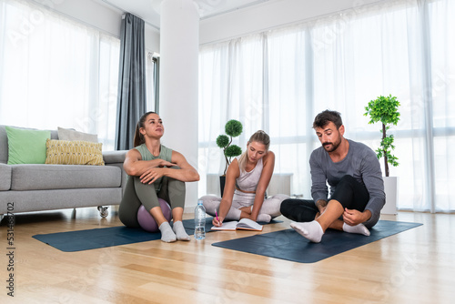 Young woman fitness and yoga instructor helping couple in their home for workout exercises. Female coach working with clients in their apartment. Husband and wife paying physical therapist for sport.