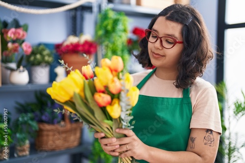 Young woman florist smiling confident prepare bouquet of flowers at florist