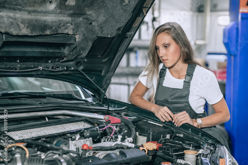 Young woman from car service in a black jumpsuit and white t-shirt standing near the broken car. The girl opened the hood and looked at the engine. Refit woman car