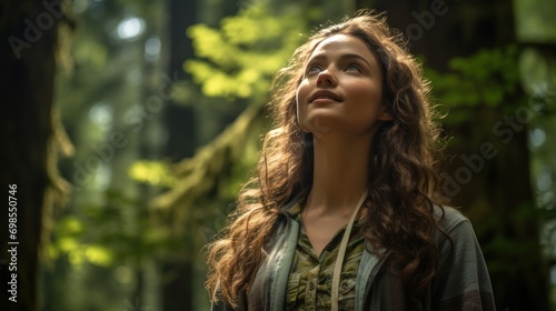 Young woman gazes upwards, her expression one of hope and serenity, amidst the tranquility of a forest.