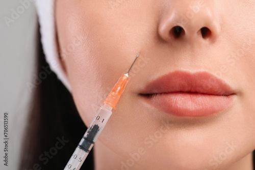 Young woman getting facial injection on light grey background, closeup. Cosmetic surgery