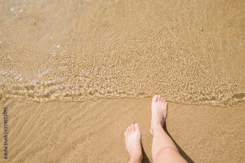 Young woman going to swim in sunny summer day on beach. Legs closeup. Point of view shot. Top down view.