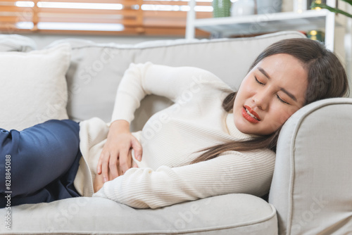 young woman gripping her stomach have abdominal pain .