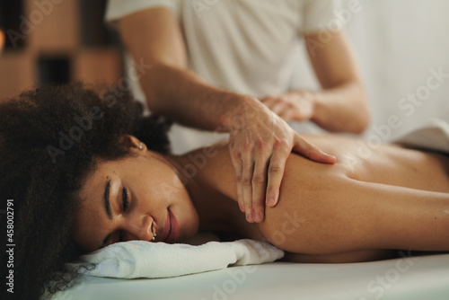 Young woman having back massage at the spa.