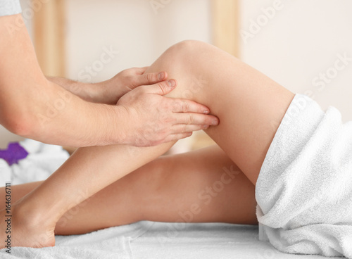Young woman having legs massage in spa salon
