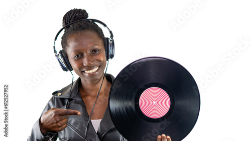 Young woman holding a vinyl while listening to music on her headphones with a white background