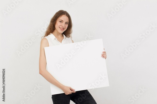 Young woman holding blank poster.Smiling woman sign board holding. Girl showing banner with copy space.