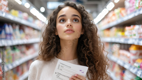 Young woman holding shopping list, looking up thoughtfully in grocery store aisle filled with products. She appears focused and engaged in her shopping experience