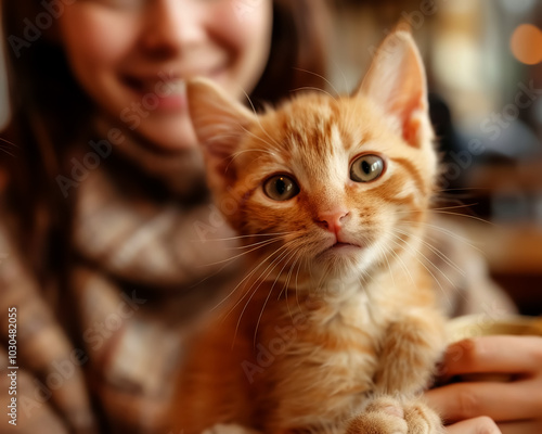 young woman holds cute orange tabby cat, showcasing warm and joyful moment. cats expressive eyes and soft fur create endearing scene filled with affection
