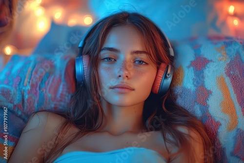 young woman immersed in her world headphones on sitting comfortably on a cozy sofa at home colorful decor adding warmth to the inviting atmosphere