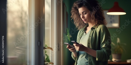 Young woman in a green sweater using a mobile phone by the window in her country house : Generative AI