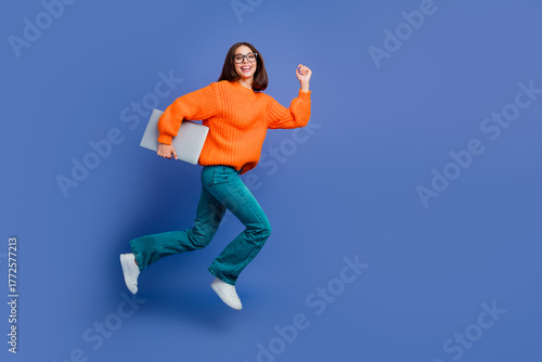 Young woman in a vibrant orange sweater joyfully jumping while holding a laptop against a solid purple background