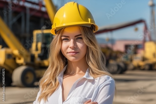 Young woman in a yellow hard hat at a construction site on a sunny day