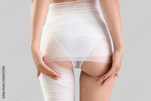 Young woman in anti-cellulite bandage on light background, back view. Body wrap procedure