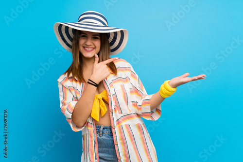 Young woman in bikini in summer holidays holding copyspace imaginary on the palm to insert an ad