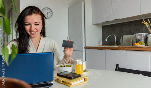 Young woman in comfortable white robe holds a credit card in her hands and makes purchases online