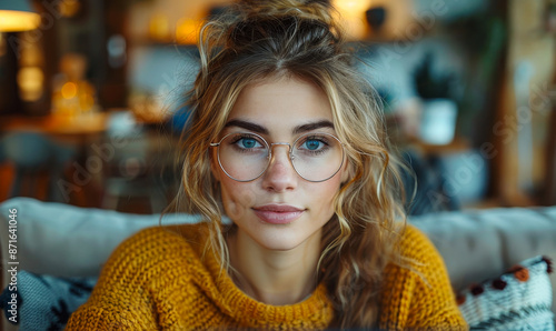 Young Woman in Cozy Living Room Wearing Glasses and Sweater, Relaxing on Couch Shopping Online with Laptop in Warm Ambient Light