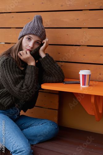 Young woman in hat and sweater sitting on the outdoor cafe, using smartphone, making selfie and drinking coffee
