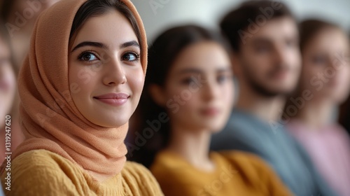 Young woman in hijab smiling, diverse group in background, engaged atmosphere, ideal for community and inclusivity themes.