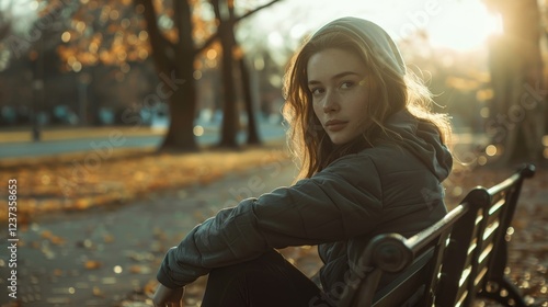 Young Woman in Hoodie Sitting on Bench During Autumn Sunset