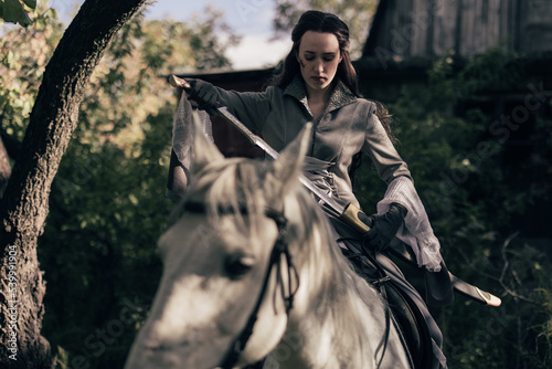 Young woman in image of ancient rider warrior sits on white horse with sword.