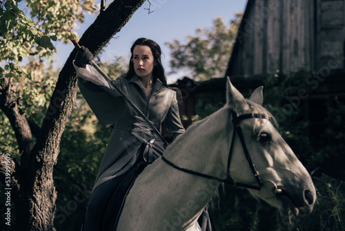 Young woman in image of ancient rider warrior sits on white horse with sword.
