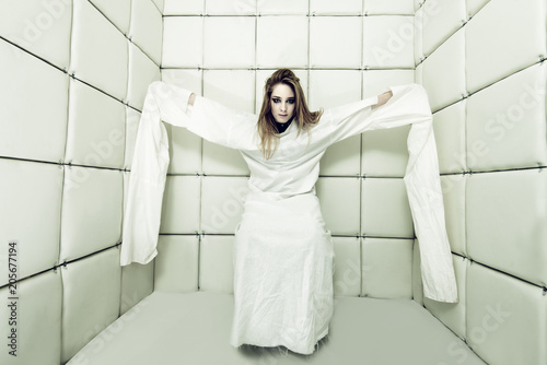 young woman in straitjacket