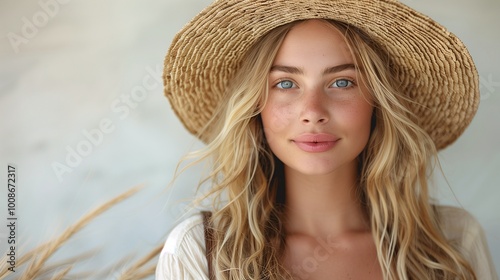 Young Woman in Straw Hat Smiling Outdoors