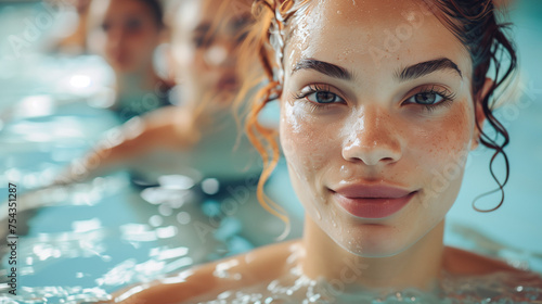 Young woman in the pool, smiles and looks in camera. Group exercise in the pool.