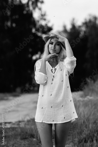Young woman in white shirt and hat poses confidently outdoors, surrounded by tall grass and trees, showcasing a carefree summer vibe with natural beauty and elegance