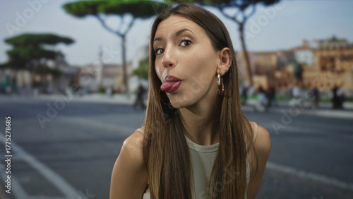 Young woman in white tank top with long brown hair sticks tongue out on urban street; cheeky playful attitude.