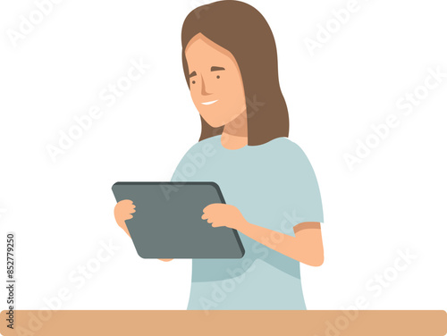Young woman is sitting at a desk using a tablet, possibly working from home