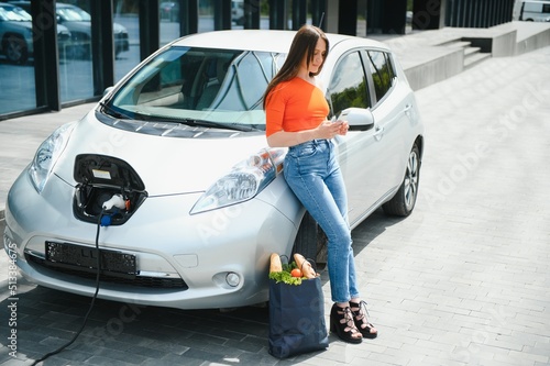 Young woman is standing near the electric car and looks at the smart phone. The rental car is charging at the charging station for electric vehicles. Car sharing.