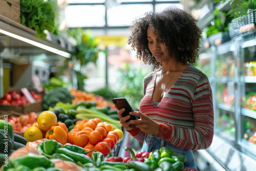 Young woman is using a shopping mobile application on her smartphone while choosing fresh produce at the supermarket