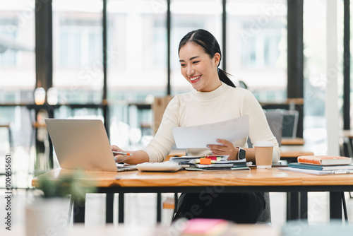 young woman is working at desk in modern office, smiling as she reviews documents on her laptop. bright environment enhances her focused and positive demeanor.