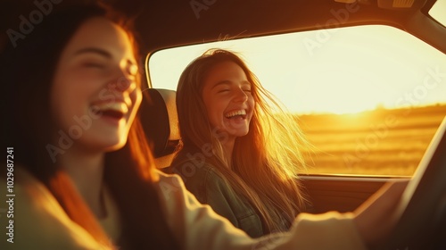 Young woman laughing joyfully as she drives down a scenic highway at sunset capturing the thrill and freedom of a road trip adventure