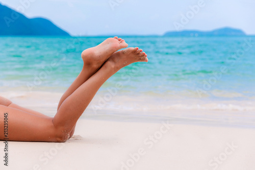 Young woman legs - multicultural - sunbath on sea beach