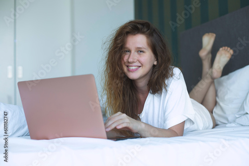 young woman lies and use laptop in bed in the morning. concept online learning, work, shopping