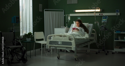 Young woman lies in a hospital bed, playing a video game on her phone.