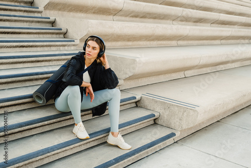 Young woman listening to music while sitting on stairs after workout